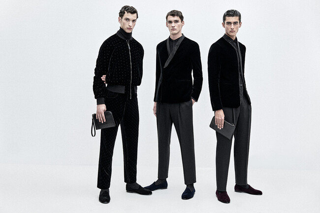 2023年秋冬シーズンは、ショールやピークトカラーのディナージャケットとコンテンポラリーなシルエットのジレやパンツに、立体感あるジャカード素材を使用したり、光沢とマットの対比効果を際立たせるクリスタルのタッチを加えたことで、スタンドカラーやミニマムカラーのシャツやネクタイ、ボウタイとのスタイリングが一層魅力的になりました。