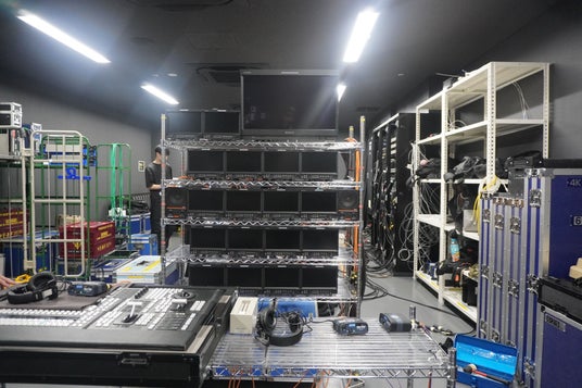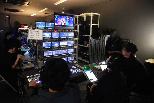 WOWOWが今年導入した最新の音声中継車を見学したり、山田尚彦さん(629テクニカルプロデューサー/ビデオエンジニア)が率いる技術チームが別室に大量の機材を持ち込んで設営したベース(ディレクターと撮影監督がモニターを見ながらカメラマンたちにインカムで指示を送る場所)の威容に見惚れていたら、14:00前にカメラマンのみなさんが続々と控え室に入ってきました。その数16名、ちなみにスタッフ総勢79名。撮影だけでこれだけの人が関わっているのです。