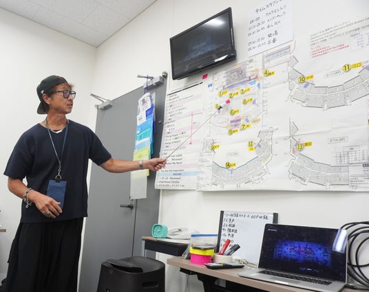 14:30から打ち合わせ。撮影監督の勝田正志さんが、カメラマンたちに向かってテーマを発表し、セットリストを掲げながら、演出上のポイント(照明の切り替わり、ステージセットの動き、お客さんの立ち/座り、バンドメンバーの位置など)を説明していきます。