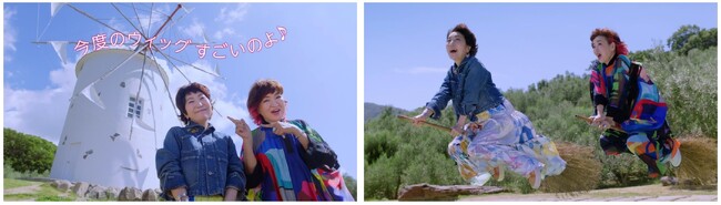 そしてCMの最後には、フォトスポットとしても有名な風車の丘を背景に、ほうきにまたがってジャンプ!風に乗ってほうきで飛んでいるようなショットや、ハイタッチをする様子、ほうきをギターに見立ててポージングするショットなど、おふたりの楽しそうな表情に注目です。旅行に行きたくなるような、明るく楽しい雰囲気のCMをお楽しみください。
