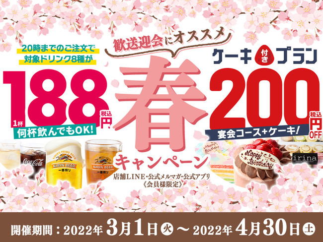 株式会社モンテローザ(本社:東京都武蔵野市、代表取締役:大神輝博)は、2022年3月1日(火)~ 2022年4月30日(土)の期間、当社の店舗LINE、公式メールマガジン、公式アプリの会員様限定「春キャンペーン」として [1] 対象ドリンク1杯188円タイムセールと [2] ケーキ付きプランおひとり様200円OFFを同時開催しています。本セールは、事前に当社公式の店舗LINE、公式メールマガジン、公式アプリのいずれかを登録(既存会員を含む)し、会員様限定に配信されるクーポンを店舗でご提示いただくことでご利用が可能です。