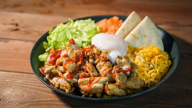 チェルシースタンドは、シェフ塩田洋介がニューヨークで修行中に味わった想い出の味を再現したブランドです。チキンオーバーライスとは、ターメリックライスとスパイシーなチキンに、ヨーグルトベースのホワイトソース、レッドチリソースをかけた屋台料理で、ニューヨークでは定番のストリートフードです。チェルシースタンドのチキンオーバーライスは、地元で行列ができるチキンオーバーライス専門店のレシピを参考に、日本流にブラッシュアップしています。一番のポイントはオリジナルスパイスでマリネしたタンドリーチキン。ご飯は 岩手県産ひとめぼれを和出汁で炊き上げたターメリックライスです。付け合わせには、契約農家から仕入れたトマト、キャベツやピタブレット、チェダーチーズを添えています。国産食材を使用したチキンオーバーライスをお楽しみください。