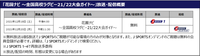 また、開幕前に大会の見どころを紹介する番組「花園ナビ ~全国高校ラグビー21/22大会ガイド~」を無料※3で放送/配信いたします。今大会の魅力をはじめ、注目校や将来のスター候補プレイヤーなどをこの番組でぜひチェックしてください。