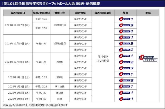 国内最大4チャンネルのスポーツテレビ局、株式会社ジェイ・スポーツ(本社 東京都江東区、代表取締役社長 長谷 一郎、以下「J SPORTS」※1)は、12月27日(月)から2022年1月8日(土)にかけて東大阪市花園ラグビー場で開催される「第101回全国高等学校ラグビーフットボール大会」の全試合を生中継します。また、PC、スマホ、タブレットで見られる動画配信サービス「J SPORTSオンデマンド※2」でも全試合をLIVE配信いたします。