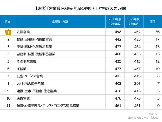 2位の「営業職」の決定年収を押し上げたのは、金融営業。不動産投資熱が旺盛なためか。2023年度451万円、2022年度は440万円の11万円アップ