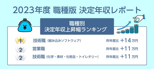 パーソルキャリア株式会社が運営する転職サービス「doda(デューダ)」(編集長:桜井 貴史)は、「2023年度 職種版 決定年収レポート」を発表します。本レポートでは2019年4月-2024年3月の期間に「doda」のエージェントサービスを利用して転職した個人のデータをもとに、2019年度から2023年度の5年間で最も決定年収※1が上がった職種の解説に加え、14職種別に2023年度と2022年度を比較し決定年収の上昇幅をランキング形式でまとめました。