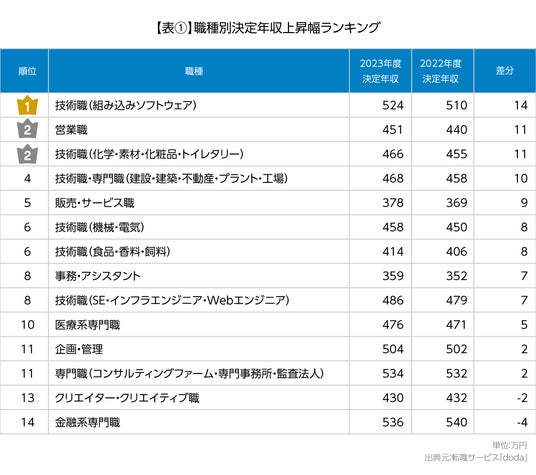 転職後に転職成功者が就いた職種における、2022年度と2023年度の決定年収額を算出し、14職種別に上昇幅をランキング化(【表1.】参照)。上位3位の「技術職(組み込みソフトウェア)」、「営業職」、「技術職(化学・素材・化粧品・トイレタリー)」について解説します。