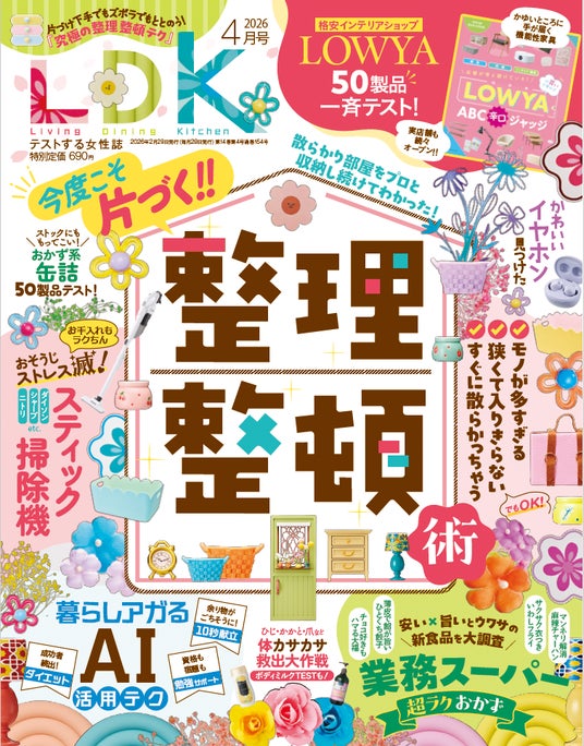 4月号は「今度こそ片づく整理整とん術」を総力特集! どんな収納悩みもキレイに解決♪プロが教えるスッキリ術を大公開!!ほかにも「暮らしをアップデートするAI活用テク」「業務スーパー最新ジャッジ」など、生活が楽しくなる情報が満載です。使う人目線の検証で見つけた本当にイイもので、心地よい暮らしを実現しましょう。