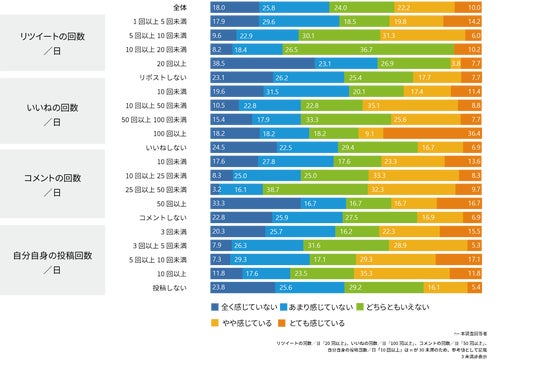 一方で、「いいね」「コメント」が多い層はSNS疲れを感じていない傾向が高い。