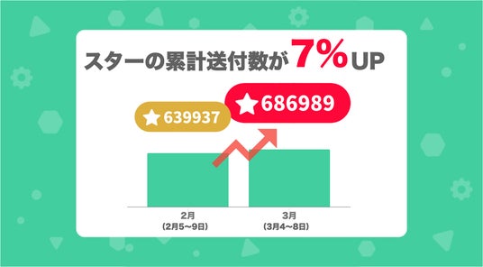 3月のキャンペーン期間中の3月4(月)~8日(金)では累計686,989個のスターが送られていました。前月同週の2024年2月5日(月)~9日(金)の累計639,937個と比較すると、約7%多い結果になりました。