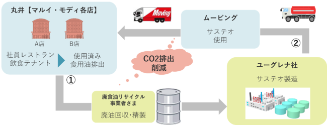 具体的には、小売事業の株式会社丸井(以下、丸井)の店舗「マルイ・モディ」の飲食テナントなどで排出される使用済み食用油を、ユーグレナ社との取り組みに基づき、バイオ燃料の原料の一部としてリサイクル活用していきます。さらに、物流事業の株式会社ムービング(以下、ムービング)の都内「マルイ・モディ」の全13店舗へ配送を行うトラックに「サステオ」を使用することによって、サーキュラーエコノミーモデルの実現を推進いたします。