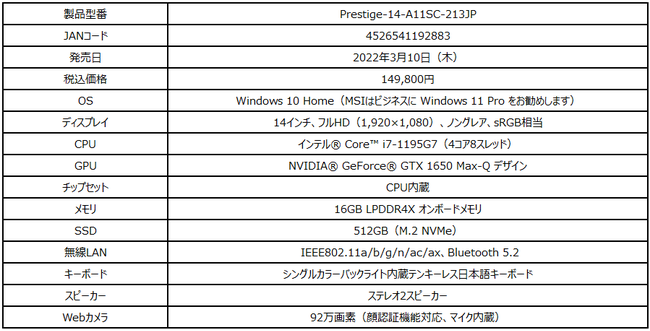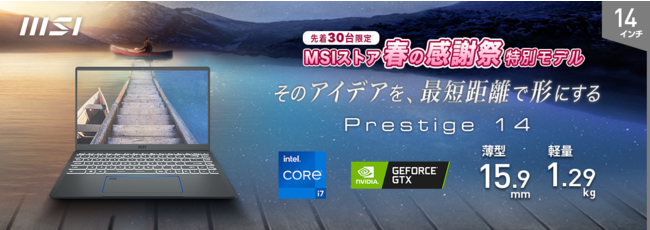 『新生活応援 MSIストア春の感謝祭』の開催を記念し2022年3月10日(木)より、薄型・軽量ビジネス・クリエイターノートPC『Prestige 14 A11』シリーズにて、高性能・高機能ながら税込15万円以下の手に取りやすい価格を実現した高コストパフォーマンスな特別モデル「Prestige-14-A11SC-213JP」を30台限定で発売いたします。