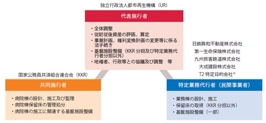 ・本事業は、代表施行者のUR都市機構が共同施行者の国家公務員共済組合連合会(KKR)と、施行分担しながら一体的に事業を推進しています。また、公募により選定した特定業務代行者の参画を経て、民間事業者の創意工夫と活力を導入しています。