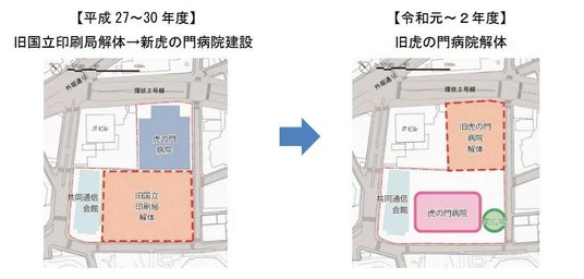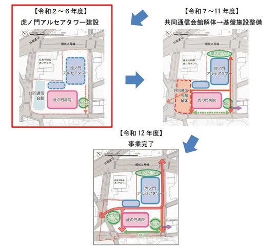 本事業は、虎の門病院、国立印刷局、共同通信会館を含む街区を一体的・段階的に開発することで、機能を停止することなく施設の更新を図るとともに、国際競争力を強化する高機能オフィスの整備、周辺地域をつなぐ安全で快適な歩行者ネットワークの形成、都市防災機能の強化、都市環境の向上を図るものです。平成24年に地権者とUR都市機構の間で再開発事業に係る協定を締結し、平成26年に東京都から施行認可を受け、UR都市機構は代表施行者として本事業を推進しています。