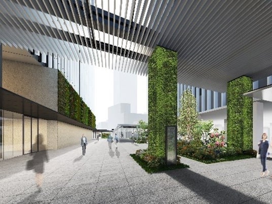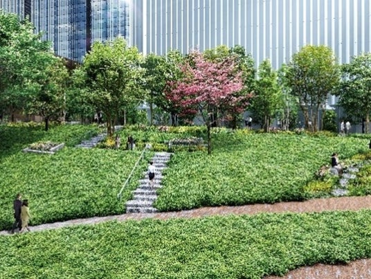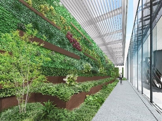 ・デッキ、屋上緑化、壁面緑化も含めると本事業地区全体で約7,500平方メートル の緑化面積を確保しています。