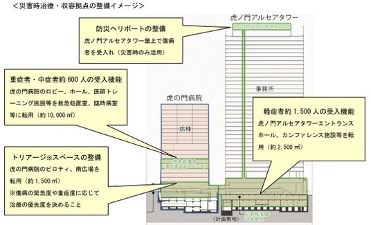 ・本事業では、虎の門病院との一体的な開発であることを活かし、平成31年4月竣工済の虎の門病院と今回竣工する虎ノ門アルセアタワーとを連携して災害対応機能を拡張することで、都内最高レベルの約14,000平方メートル の災害時治療・収容拠点を整備します。