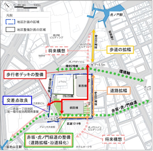 ・本事業地区周辺は、土地の高低差、広幅員の幹線道路や不整形な交差点による回遊性の支障、歩行者空間の不足など歩行者ネットワーク上の課題がありました。本事業で、歩道の拡幅、歩行者デッキの整備などを行い、虎ノ門駅方面、虎ノ門ヒルズ駅方面、溜池山王駅方面、ホテルオークラ方面への安全で快適な歩行者ネットワークの形成を図ります。あわせて、周辺道路の拡幅、アメリカ大使館前の交差点改良による不整形な交差点の解消など周辺の自動車交通の円滑化も図ります。