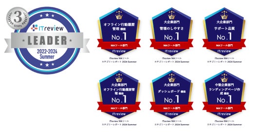また、MAツール部門のすべての部門において、オフライン行動履歴管理でNo.1を獲得したほか、大企業部門では4項目でNo.1を獲得(管理のしやすさ、サポート品質、オフライン行動履歴管理、ダッシュボード)、中堅企業部門では1項目でNo.1を獲得(ランティングページ作成)しています。