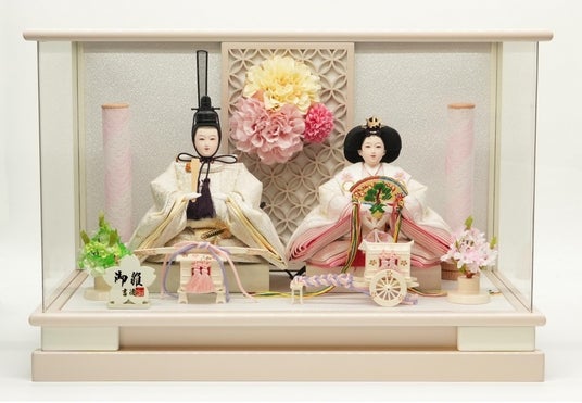 グレージュのアクリルケースに縁起の良い七宝つなぎの格子を施し、花飾りを付けた背景のケース飾りです。ケースは正面に柱のないパノラマタイプです。前飾りには御駕籠と御所車を配しました。