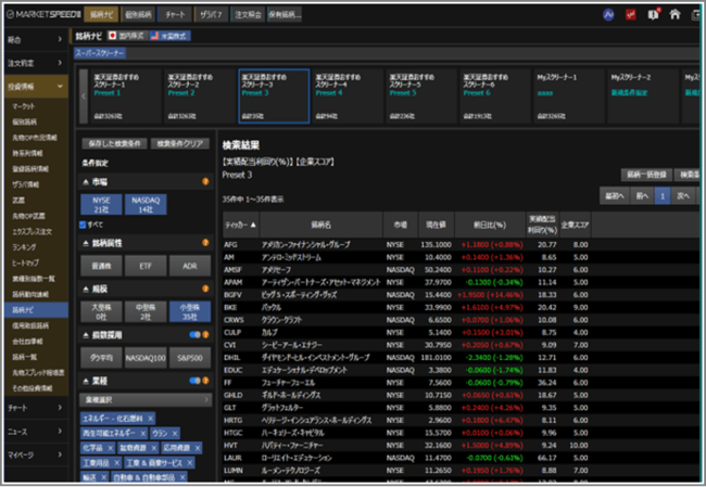 「米国株スーパースクリーナー」は、財務指標やテクニカル分析などの複数条件から、対象銘柄を検索できる機能です。財務指標(19種)やテクニカル指標(20種)に加え、コンセンサス情報(7種)、株価関連情報(11種)、ETF経費率といった計58種類の検索条件から、精度の高いスクリーニング検索ができ、お客様の投資条件にあった銘柄を見つけることに役立ちます。国内株式で提供している「スーパースクリーナー」と同様の操作方法で利用できるだけでなく、はじめてスクリーニング機能を利用される方のために、「楽天証券おすすめスクリーナー」を数種類ご用意します。「楽天証券おすすめスクリーナー」をご利用いただくことで、検索条件をご自身で指定することなく、スクリーニング検索をはじめていただくことが可能です。また、よく利用する検索条件は、「Myスクリーナー」として登録もでき、素早い検索が可能になります。「米国株スーパースクリーナー」は、パソコンはもちろん、スマートフォン向け株式トレーディングアプリ「iSPEED(R)」やパソコン向け株式トレーディングツール「MARKETSPEED II(R)」でもご利用いただけます。