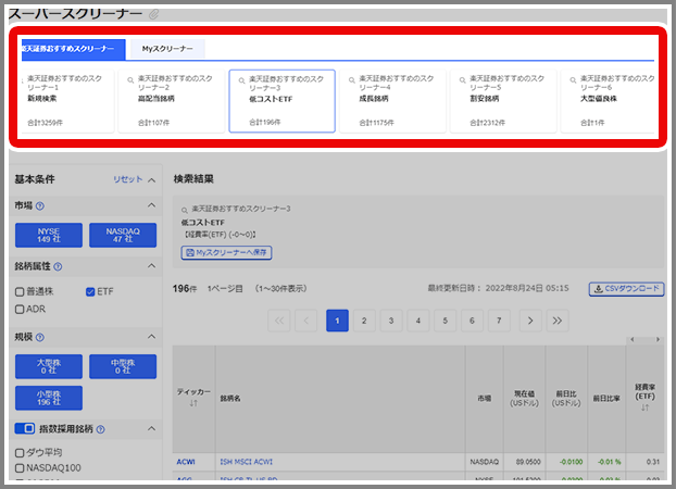 <楽天証券おすすめスクリーナー パソコン画面イメージ>
