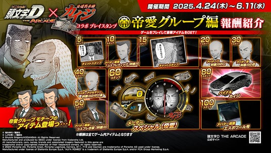 株式会社セガ フェイブ(本社:東京都品川区、代表取締役社長執行役員:杉野行雄、以下 セガ フェイブ)は、アミューズメント施設向けタイトル『頭文字D THE ARCADE(以下、頭文字DAC)』におきまして、2025年4月17日(木)より『カイジ』とのコラボレーションイベントを開催いたします。