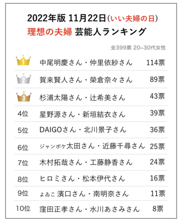 11位以降は、2022年結婚し注目を浴びたユーチューバー東海オンエアのリーダー てつやさん・元AKB48の峯岸みなみさんご夫婦、お互いが俳優、女優で美男美女カップルとして話題の菅田将暉さん・小松菜奈さんご夫婦、バラエティにも登場するオシドリ夫婦 お笑い芸人あべこうじさん・元モーニング娘。の高橋愛さんご夫婦の名前があがりました。