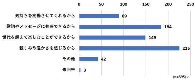 また、昭和歌謡のどんなところを魅力と感じるか尋ねると、全体では「親しみや温かさを感じるから」が225件でトップでした。以下、「歌詞やメッセージに共感できるから」(184件)、「世代を超えて楽しむことができるから」(149件)、「気持ちを高揚させてくれるから」(89件)の順でした。