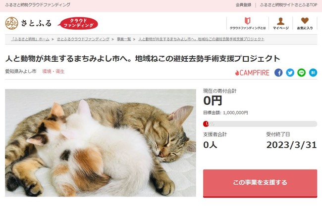 愛知県みよし市とふるさと納税ポータルサイト「さとふる」(https://www.satofull.jp/)を運営する株式会社さとふる(本社:東京都中央区、代表取締役社長:藤井 宏明)は、寄付金の使途に応じて事業を立ち上げ寄付を募る「さとふるクラウドファンディング」(https://www.satofull.jp/projects/top.php)にて、飼い主のいない地域ねこの避妊去勢手術支援を継続するため、2022年4月1日より寄付受け付けを開始します。