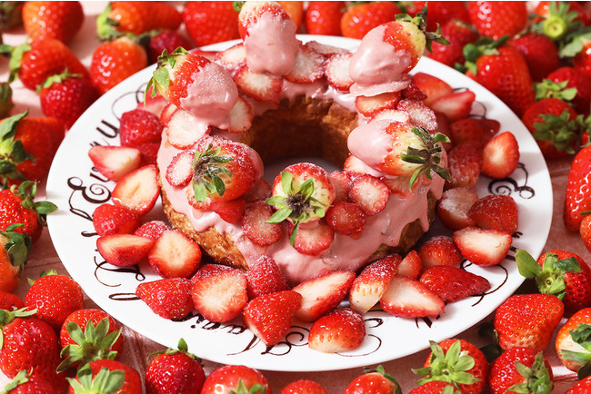 いちご風味のチョコリング生地の中には、いちごチョコレートとホワイトチョコレート入り。春らしくいちごチョコのコーティングを加え、チョコリングから溢れる限界までフレッシュないちごを飾った”よくばり”のネーミングにもふさわしい「いちごづくし」なチョコリングに仕上げました。