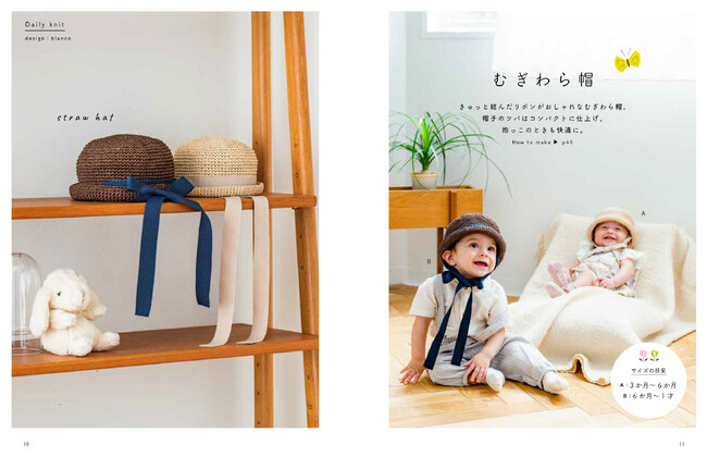 本書には、日常使いができる帽子やボンネット、記念日用のコスチュームは、小さいときにこそ着用させたいデザインを掲載しています。