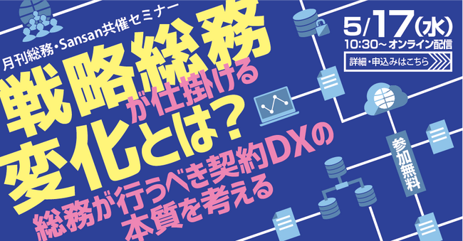 働き方を変えるビジネスデータベースを提供するSansan株式会社は、日本で唯一の総務専門誌『月刊総務』を発行する株式会社月刊総務と2023年5月17日に戦略総務をテーマにした共催セミナーを開催します。