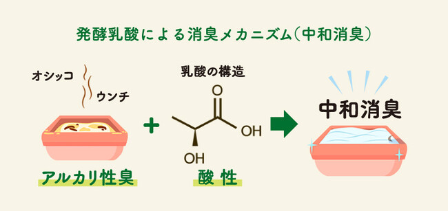 乳酸菌生まれの消臭成分である発酵乳酸(※)配合により猫ちゃんがなめても安心な処方です。天然の本格消臭成分である北海道産モミの木(トドマツ)の樹木水を配合し、さらに「消臭力」との共同開発により猫ちゃんのウンチ・オシッコのニオイへの高い消臭効果と猫ちゃんにやさしい処方を同時に実現しています。