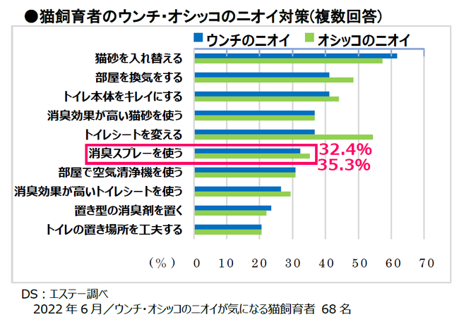 猫ちゃんを飼っている家庭においてウンチやオシッコのニオイ対策として消臭スプレーの使用は、ウンチで32.4%、オシッコで35.3%となっています。トイレそのものの対策や部屋の換気に加え、消臭スプレーも一定数併用されていることがわかりました。