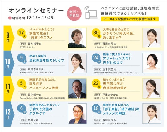 「働く女性 健康スコア2024」と昨年セミナー受講者様の意見を参考に、本年度のセミナーが決定いたしました。どなたでも参加可能ですので、一般の方はぜひ申込ページよりご登録ください。