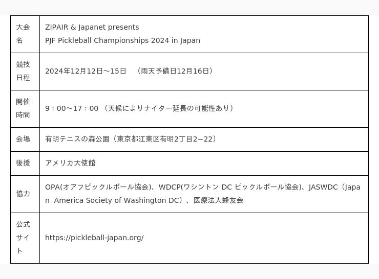 「PJF Pickleball Championships 2024」は日本、アメリカ、オーストラリア、アジアなどから約500人の選手が参加する予定の日本最大の国際大会であり、アメリカのトッププロ選手を招待し、間近でショーイベントを見ることができるのはアジア初となります。