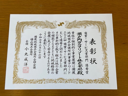 新事業アワードは、備後地域商工会議所管内(笠岡・井原・尾道・三原・府中・竹原・因島・福山の各会議所管内)において、新商品・新技術等の開発および独創的かつ市場性のある新事業展開に取組んでいる事業所を表彰することにより、備後地域の商工業の発展を図るものです。この度、瀬戸内ゴルフリゾートは、備後地域商工会議所管内の会員事業所で、優れたアイデアや商品、技術、サービス、またはその提供方法に著しい新規性を有する事業を展開し、将来にわたり大きく発展が期待される企業として、新事業アワード2024(商業・サービス業部門)で優秀賞を受賞。表彰式は、令和7年2月26日(水)に開催予定の第15回ビジネス交流フェア(主催:福山商工会議所/場所:福山ニューキャッスルホテル)にて行われました。