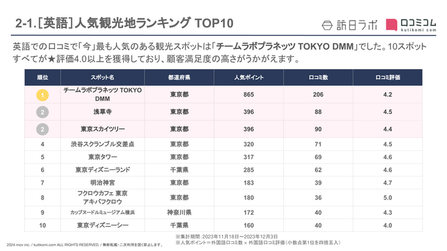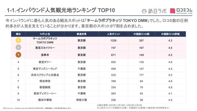 国内最大級のインバウンド総合メディア「訪日ラボ」及び 口コミサイトを”もっと”売上に変える店舗支援SaaS「口コミコム」を運営する株式会社mov(代表取締役:渡邊 誠、本社:東京都渋谷区、以下mov)は、観光名所に寄せられた最新の口コミデータから、独自の『インバウンド人気観光地ランキング』を発表しました。