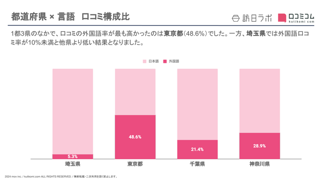 1都3県のなかで、口コミの外国語率が高かったのは東京都(48.6%)でした。一方、埼玉県は外国語口コミ率が10%以下と他県より低い結果となりました。