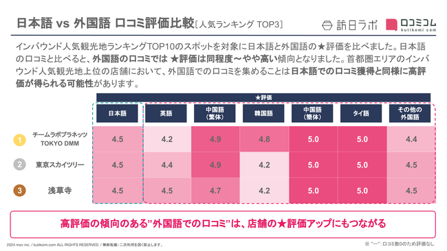 首都圏エリアのインバウンド人気観光地上位の店舗において、外国語での口コミを集めることは日本語での口コミ獲得と同様に高評価が得られる可能性があります。