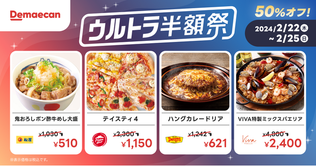 2024年初の開催となる今回は約7,000の加盟店が参加。期間中は松屋の「鬼おろしポン酢牛めし大盛」やピザハットの「テイスティ4 Mサイズ」などをはじめとした、人気のメニューが通常価格の50%OFFでご注文いただけます。