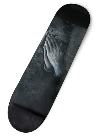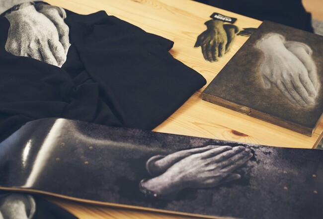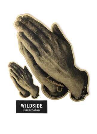 本コラボレーションでは、WILDSIDEの為に描きおろした絵画『祈る手』をTシャツ、フーディー、スケートボード、ステッカーに落とし込んだアイテムを展開いたします。Tシャツの袖口、フーディーのフード部分には、内田すずめ氏直筆のロゴをプリント。また、数量限定で発売するステッカーには、直筆サインが入っております。