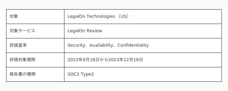 当社は、米国子会社のサービスであるLegalOn Reviewのセキュリティ、可用性、機密保持に関連する内部統制について一定期間評価を受けた結果、監査法人から内部統制が適切にデザインされ、持続的、かつ、適切に運用されていると評価されています。