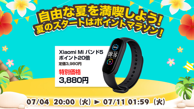 楽天市場「Show !t」は7月4日(火)20時から、シャオミのMiバンド5を通常価格3,980円(税込)のところ3,880円(税込)の特別価格で販売し、さらにご購入の方にポイント20倍プレゼントを実施します。また、7月4日(火)20:00~7月11日(火)01:59まで開催される、楽天お買い物マラソンに参加し、ポイント10倍プレゼント(一部商品を除く)を実施します。この機会にシャオミのスマートバンドMiバンド5でポイントをザクザク貯めましょう。
