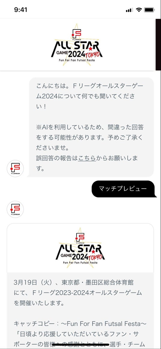 「株式会社and.d(東京都町田市、https://and-d.tokyo/)様」ご協力のもと、「Fリーグ公式AIチャットボット」の開発を進めておりましたが、オールスターゲームに向けて「Fリーグ公式AIマッチデープログラム」を公開する運びとなりました。AIマッチデープログラムはAIチャットボットを基盤として構築しているため、オールスターゲームに関する基本情報が閲覧できるほか、Fリーグやフットサル、出場選手について会話形式で知ることができるサービスです。