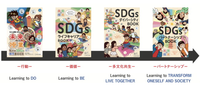『未来の授業』シリーズは、これからの未来を担う子どもたちが日本や世界の課題を知り、関心を持ち、アクションを起こすことで、2030年以降のよりよい未来づくりの一助となることを目指します。2019年に第1弾となる『未来の授業 私たちのSDGs探求BOOK』を発行。以来1年ごとに「SDGsライフキャリアBOOK」「SDGsダイバーシティBOOK」と発刊を重ねてきました。第4弾となる「SDGsパートナーシップBOOK」は、複雑性を増す社会の中で、多様な個人や組織の力を持ち寄る「パートナーシップ(協働)」で問題を解決していく重要性を伝えます。この4冊はユネスコの生涯学習論に対応し構成されています。シリーズ累計での発行部数は17万部を超えました。
