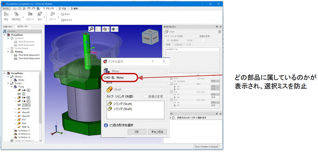 公差解析対象の形体(CADモデルからCETOL上に取り込む面や点など)を選択する際、その形体がどの部品の面や点なのかが明確に表示されるようになりました。これにより、構成部品数が多かったり重なったりしている場合でも選択ミスを防ぎ、迅速な作業を実現します。また、次に選択すべき対象をメッセージで表示したり、連続して形体を選択したりするオプションが追加されたため、作業効率が向上します。
