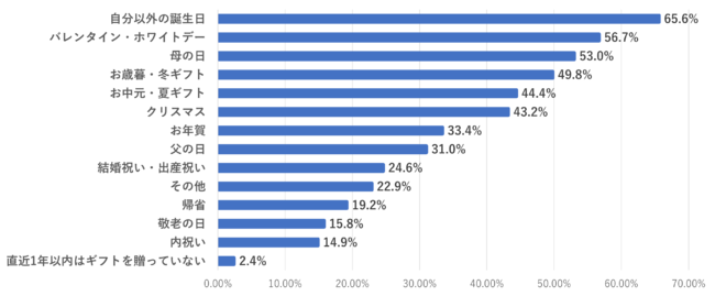 ギフトを贈る機会として最も多かったのは「誕生日」。次点以降は「バレンタイン・ホワイトデー」「母の日」「お歳暮・冬ギフト」と季節イベントが上位にランクインしました。購入場所は「オンラインショップ・ネットショップ」の回答が「デパート・百貨店の実店舗」を20%以上上回る結果に。パソコンやスマートフォンで手軽に贈りものを探せる時代になったことにより、「何を贈るか悩んだ」という声が75.8%と、ユーザーのお悩みのトップに挙がりました。さらに、ギフトを探しているうちに、「つい自分用にも購入したことがある」と回答したユーザーが88.7%もいるというユニークな動向も明らかに。