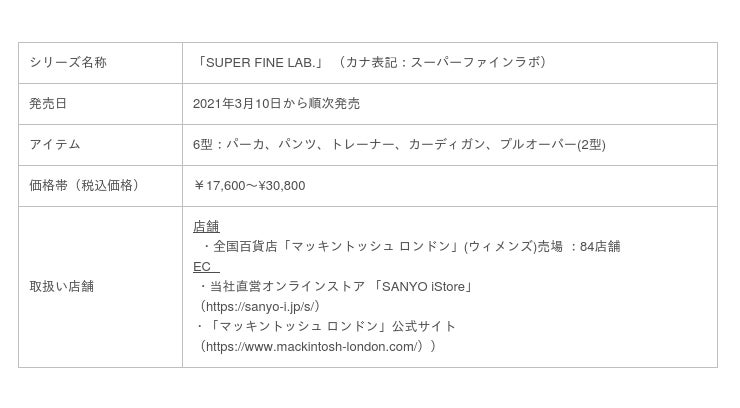 三陽商会が展開するブランド「マッキントッシュ ロンドン」ウィメンズは、身も心も健やかに過ごせる最高の気持ち良さを叶えるための素材研究にフォーカスし、ベーシックウエアに仕立てた新シリーズ「SUPER FINE LAB. (スーパーファインラボ)」を、全国百貨店84店舗と当社直営オンラインストアの「SANYO iStore(サンヨー・アイストア)」等にて3月10日より順次発売しています。着心地が良い開発素材を用い、普遍性のあるシンプルなデザインと、家庭洗濯可能なイージーケアな要素を併せもち、ステイホームからワンマイルウエアとしてのニーズにも対応する商品としてご提案いたします。