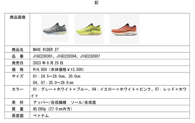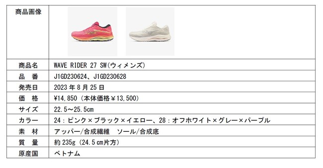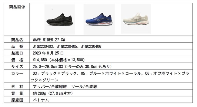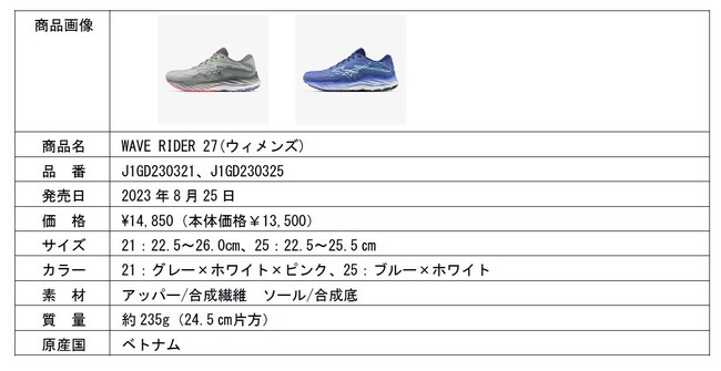 「WAVE RIDER」シリーズは、1997年のデビュー以来、グローバルで累計販売数1,000万足を超えるミズノのランニングシューズで最も人気のあるシリーズです。今回27代目となる「WAVE RIDER 27」はソールのクッション性は前モデルから維持したうえで、アッパー部分のフィット感の向上を図りました。